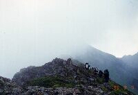 今日はいよいよ槍ヶ岳をめざす日である。テントから顔を出すと既にヘッドランプをつけた登山達が行動を開始している。すこし霞がかかっているが遠くに槍ヶ岳がみえる。西鎌尾根は岩稜というよりも岩のくずの上を歩く感じでいやらしい。途中からガスがでてきて槍ヶ岳は見えなくなる。西鎌尾根の最後の上りをふんばると意外なほどあっさりと小屋の横に出た。視界がきかなかったせいか、「あれ?もう?」という感じであった。