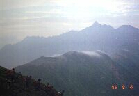 三俣蓮華岳へののぼりは意外と急である。途中で下ばかり見ていたら木で頭をぶつけ、たんこぶをつくってしまった。稜線にあがると遠方がすこしかすんで見える。