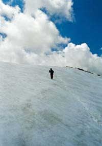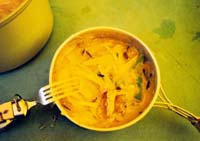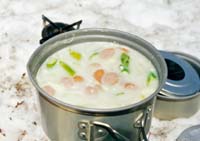 | 沸騰した湯に玉ねぎ1個とソーセージをほうり込む。その後、クリームシチューの素を1/2入れてよくかき混ぜる。最後ににアスパラガスを入れ、やわらかくなったらチーズを細かくちぎっていれる。チーズが溶けてきたら出来上がりだ。 | 白馬山行ではルーとサラミのみの単純なものであったが、今回は行動距離が短いので具の研究を試みた。今回は野菜としてははじめてアスパラガスを使用してみたが見た目が美しいし、歯ごたえがあるので「食べてる〜」と感激出来るほどである。ただし夏場はどれくらい持つかは不明。 | |