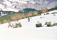 ムジナ沢上部のきつい登りの後、左側の尾根に乗り、鳩待峠からの道と合流した。なんとこちら側はすでに雪が溶けており、露出した木の階段を登って至仏山頂上に到着。鳩待峠からの登山者、山スキーヤーが7人ほどいた。見慣れない上越の山々を方位盤を頼りに見ながらおもわず「よく来たなあ」とつぶやく。しばしの休息後、いよいよ大滑降のはじまりだ。雪はすこし重くなってきているが、気にしない。歓声をあげて大斜面にとびこむ。