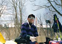 自分だけのシュプールを刻み、あっという間に山の鼻に到着。ひうちヶ岳は滑降できる斜面が裏側なので今回はキャンセルすることにする。クリームシチューで豪華な昼食を楽しみ、いざ鳩待峠へ。入山した時に比べて雪が融けている。さっそくスキーを担ぐ羽目に。苦しい1時間半の歩きを終えて鳩待峠に到着。