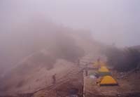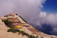 テント設営後、カメラを持って燕岳を目指す。稜線から裏銀座の山がきれいに見える。まだガスも沸いていない。頂上にはアマチュア無線が趣味のおじさんがひとりいた。「ずっと見ていても飽きないね」というおじさんの言葉どおり今日の北アルプスはド快晴。展望360度。展望を約1時間楽しんだ後テントに戻る。このころになると下から○×山岳会の中高年団体(ほんまにおばはんばかり)やアウトドアしてるぜ勘違いお兄さんたちがうじゃうじゃ登ってきて、99.9%がそのまま燕山荘に吸い込まれていく。きっと今日はウナギの寝床なんだろなー。13:00ごろからガスが発生し、次第に視界不良となる。これでは夕焼け撮影は無理やなとあきらめ、シュラフに包まるとスッと寝てしまった。7時ごろ目がさめ、外を見るとふもとの街がみえるではないか!しまったあと思い、カメラを持って稜線に駆け上がるが時すでに遅し。夕日は稜線の彼方に沈んだ後だった。金星の輝きを見つめながら「明日晴れたら、モルゲンロートを狙おう」と言い聞かせ、床についた。 <7/11>