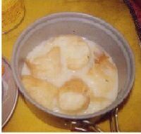 カップスープの素を2袋入れてみたが、パンに水分を吸い取られてしまい、味がややy薄くなってしまった。塩とコショウがあればよいかもしれない。しかしながら刺激が少ないので朝の食事としては使えるのではないかと思う。 フランスパンは膨らむので、小さめにちぎったほうがよい。 |