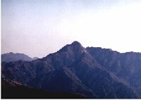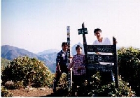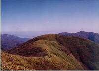 頂上まではこれまた背丈ほどの伊吹笹で被われている。1m93cmのまりも氏は胸から上がでているが、私の妻は完全に笹の中に隠れてしまう。雨乞岳の山頂からは鈴鹿の奥深い、山々がはっきりわかる。山頂から見る鎌ヶ岳はこれまた格好いい。尾根のよろいをまとった山というのはなんだがずっしりしてたくましい感じがする。しばしの展望を楽しんだ後、東雨乞岳へ。こちらはずいぶん人でにぎわっている。ドーナツを食べたあと、展望に別れを告げ、下山を開始。 |