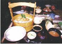 ふっくらごはん 具いっぱいみそしる 白菜の漬物 みそたっぷりのみそカツ 千切りキャベツ おいもサラダ ところてん(黒蜜) |